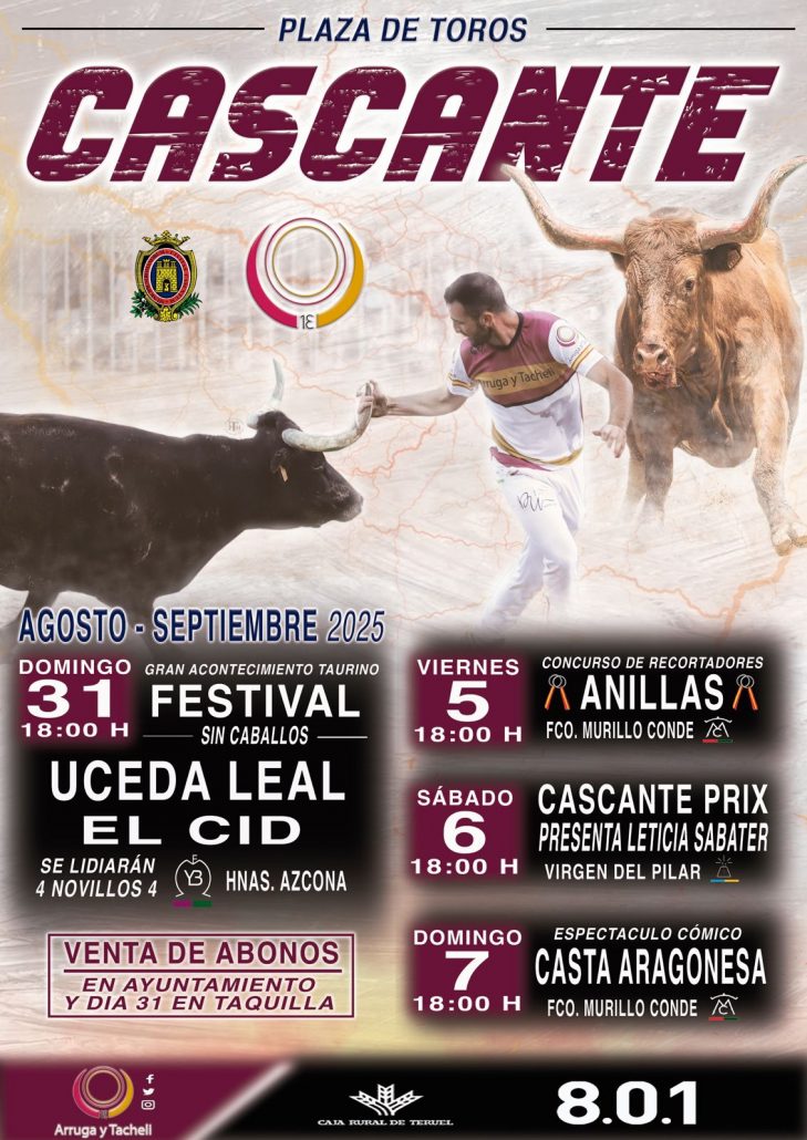 ➡️Continuamos con los festejos populares para el siguiente fin de semana. Entre ellos encontramos el concurso de Recortadores con Anillas ante reses de la ganadería Murillo Conde; un divertido Cascante Prix, presentado por la icónica Leticia Sabater y con animales de la ganadería Virgen del Pilar; y para poner el broche final a la feria, tendremos el espectáculo cómico taurino Casta Aragonesa.